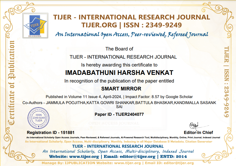 Published "SMART MIRROR" research paper in TIJER - Vol 11, Issue 4.